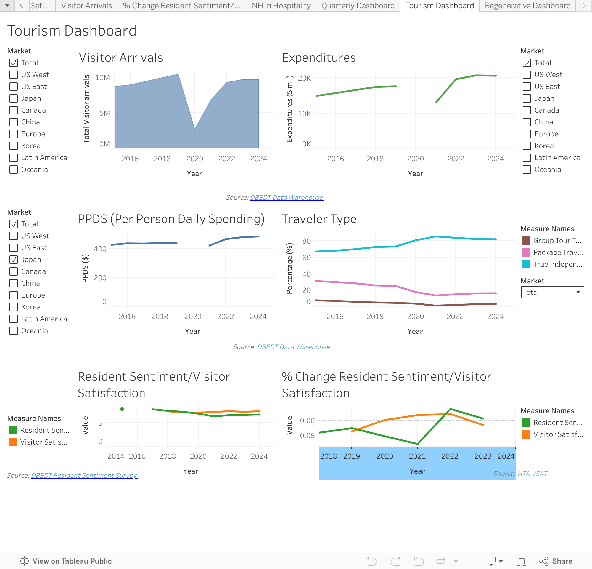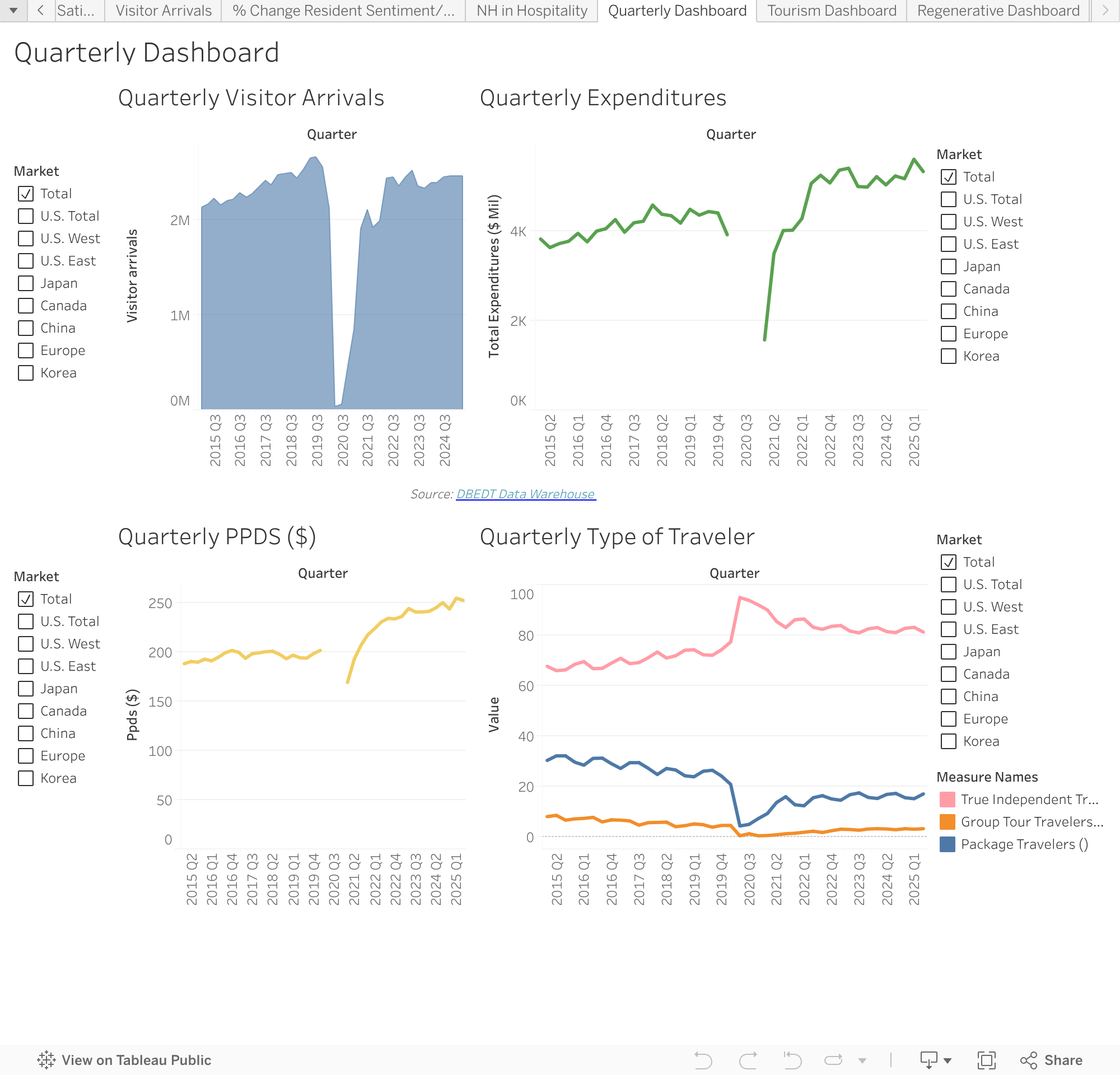 Ward Research’s Quarterly Dashboard provides key tourism metrics but at the quarterly level. Toggle between different markets for insight into each major market area. Data on this dashboard will be updated quarterly.