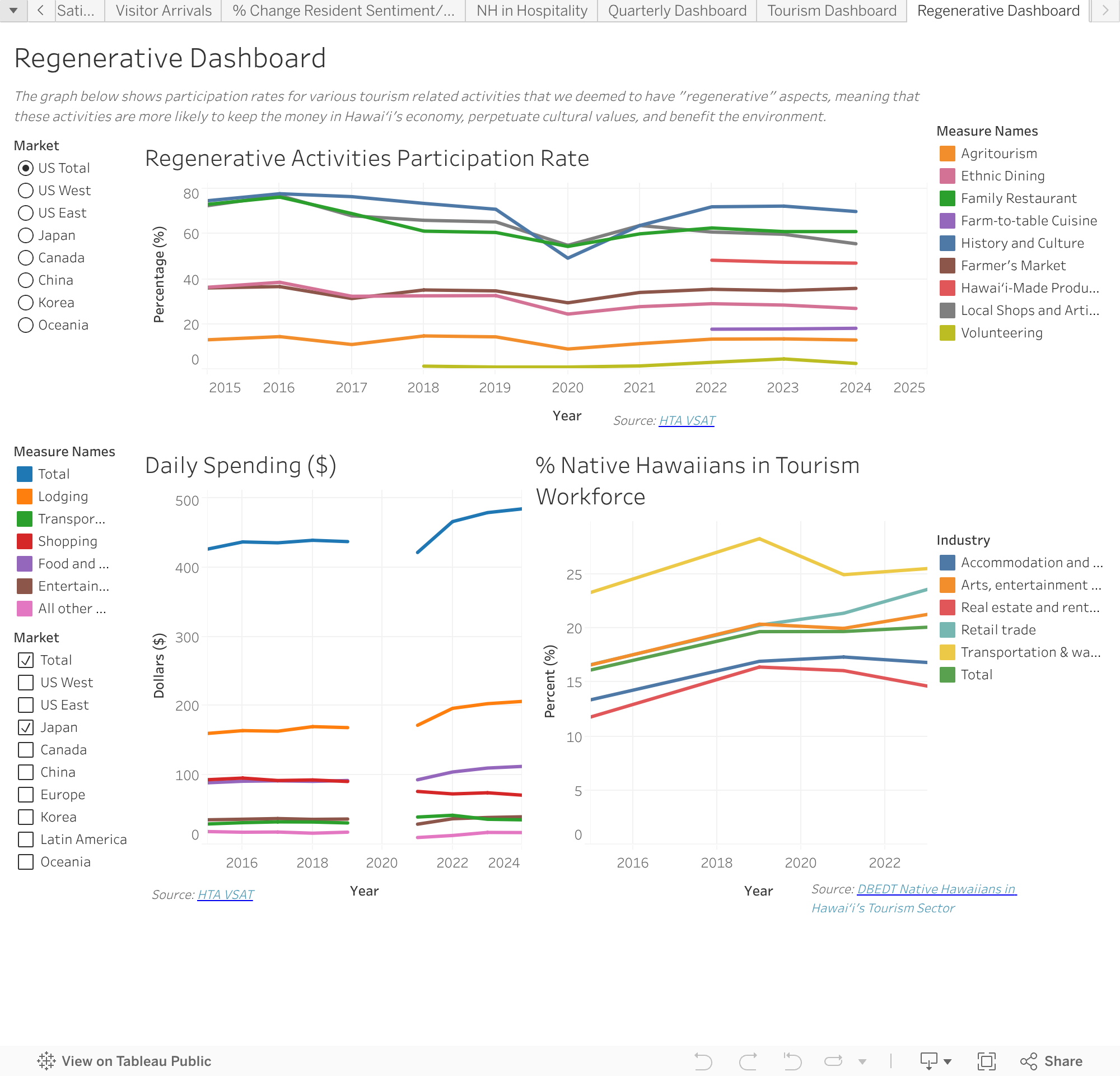 Regenerative tourism is a sustainable approach to travel that aims to leave a destination better than it was before. Ward Research’s Regenerative Tourism Dashboard includes metrics that can provide insights into regenerative aspects of tourism including participation in regenerative activities, spending on certain categories, and the rate of Native Hawaiians working in tourism. We believe these metrics are the best available measures of Regenerative Tourism in Hawai‘i. Toggle between different markets for insight into each major market area. Data on this dashboard will be updated annually.